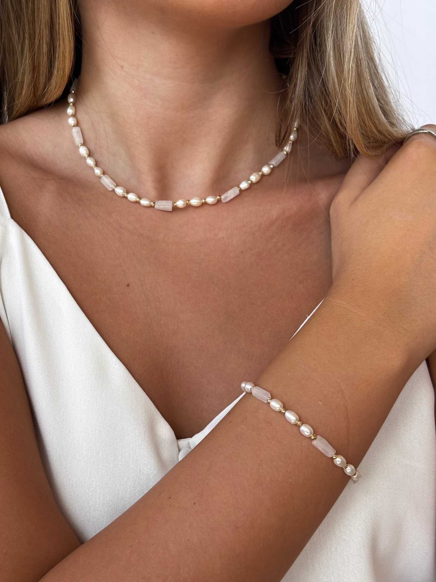 שרשרת דיאנה - שרשרת אבנים טבעיות רוז קוורץ ופנינים