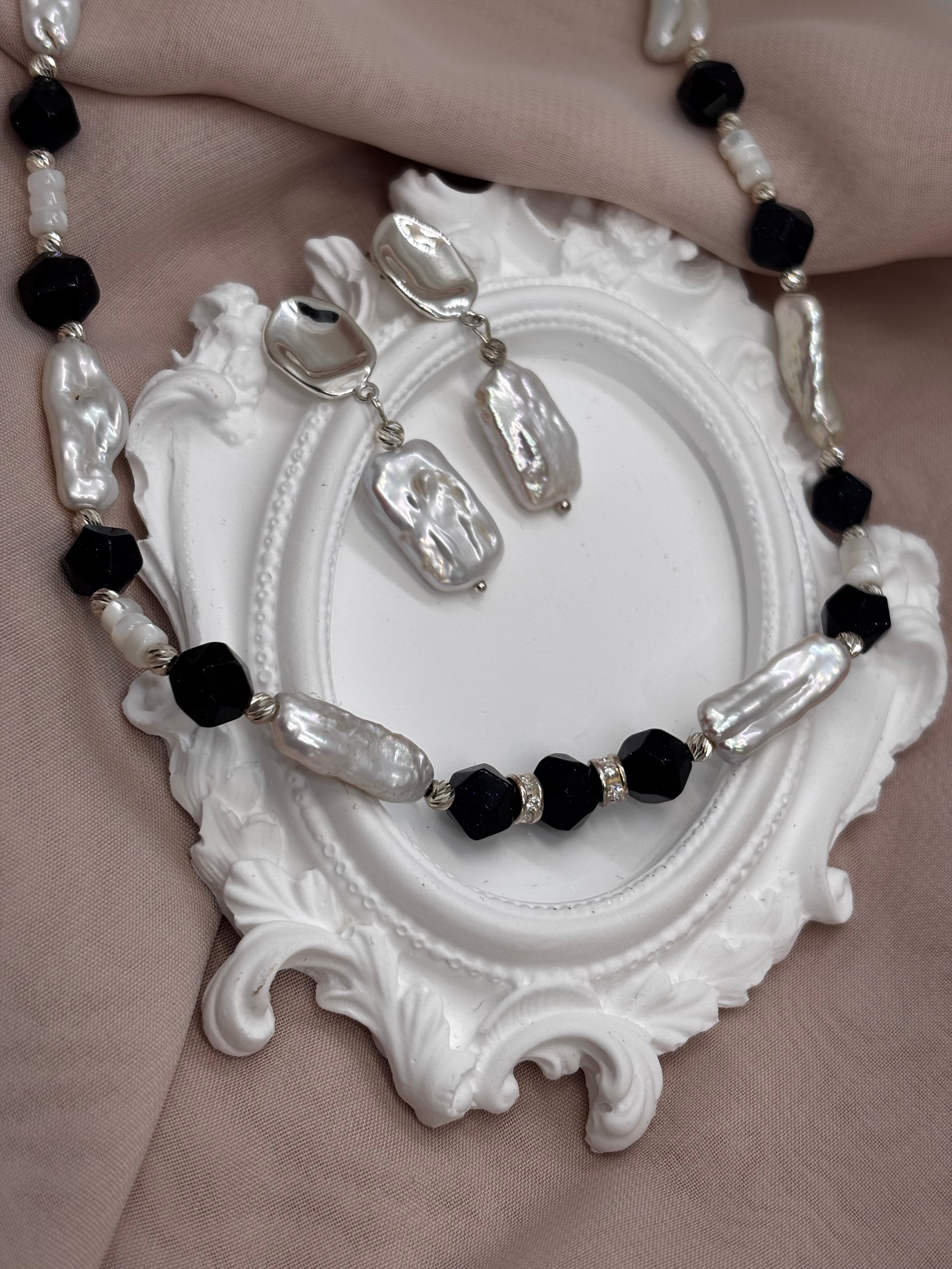 סט סלין - תכשיטים עבודת יד בשילוב כסף אמיתי 925, אבן אמזונייט טבעית ופנינים